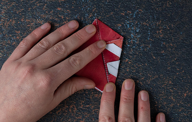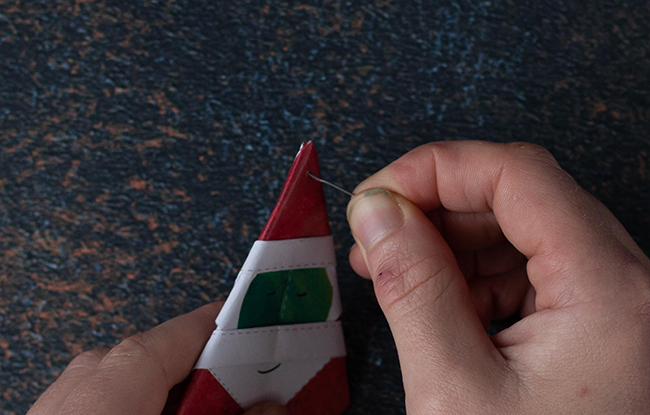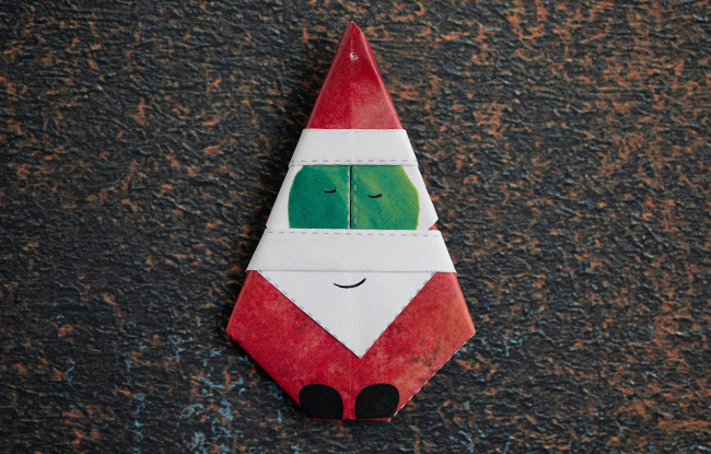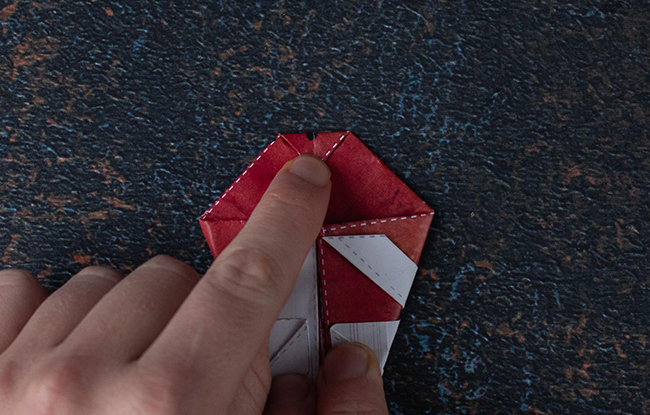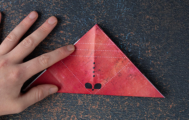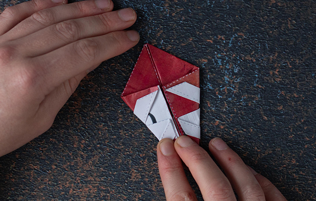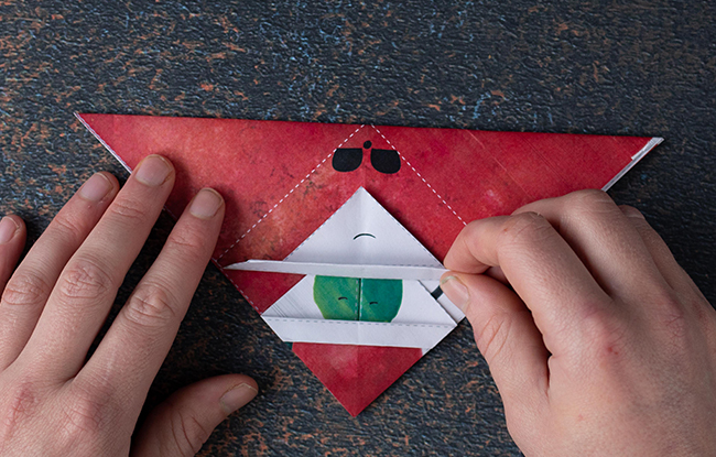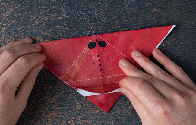 6. Fold the top corner of the triangle down on the dotted line, to reveal Santa’s face beneath. Fold it over on the dotted line on the white paper to shape his beard.
