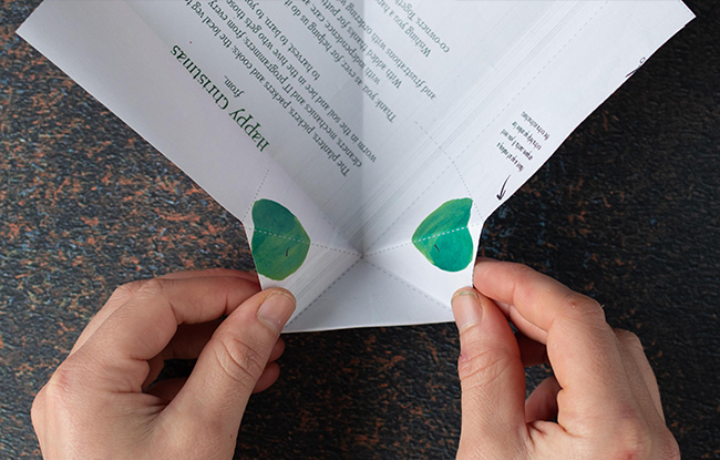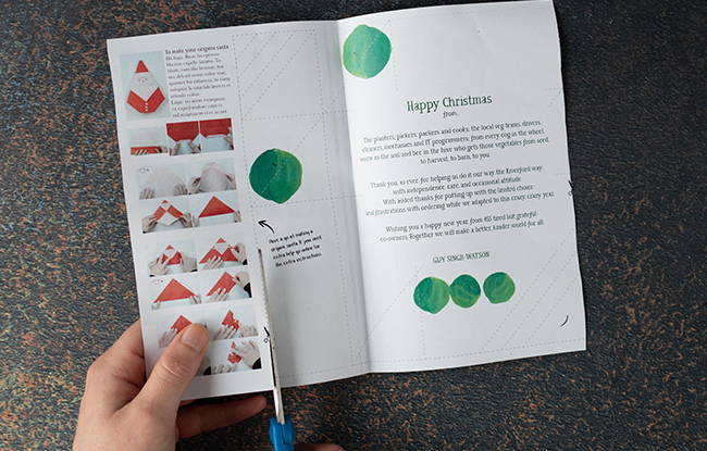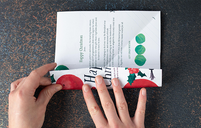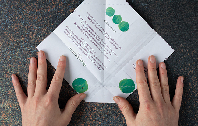 3. Bring the above corner round to face you, and fold it forward four times, as if you’re rolling it away from you, along the dotted lines. Make one more, larger, fold along the diagonal dotted line, so that you can see half of the sprouts on the other side of the paper. Unfold just this last fold, to keep the crease.