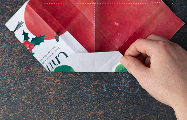 8. Fold along the dotted line to bring the bottom right and bottom left edges into the centre, making a kite shape. Fold the top point of the kite down a little bit. Turn it over – you’ve completed your origami Santa!